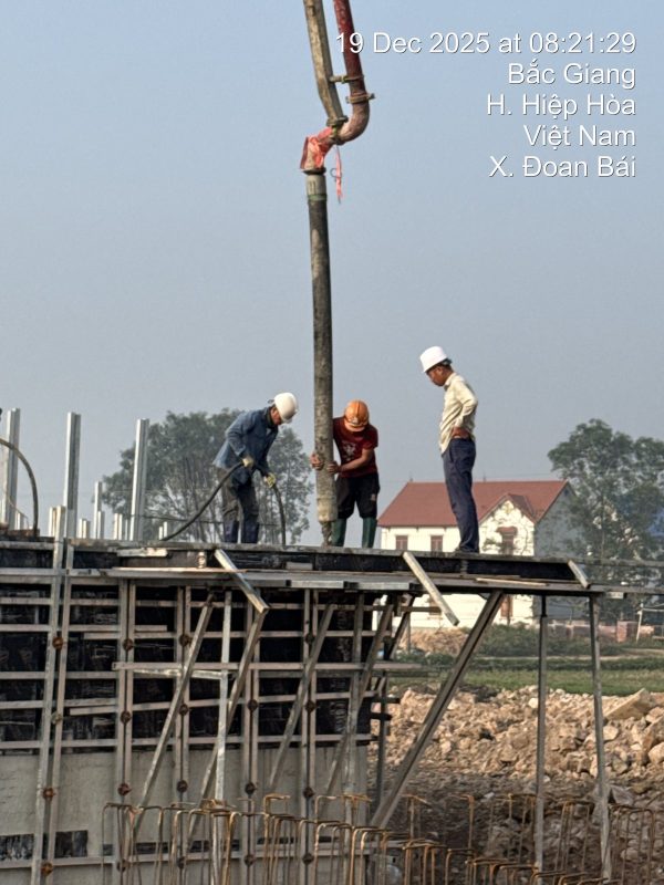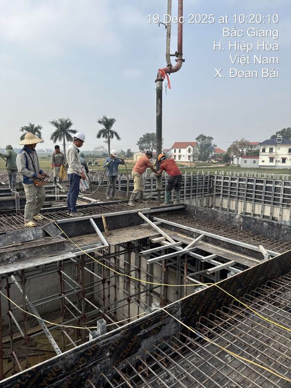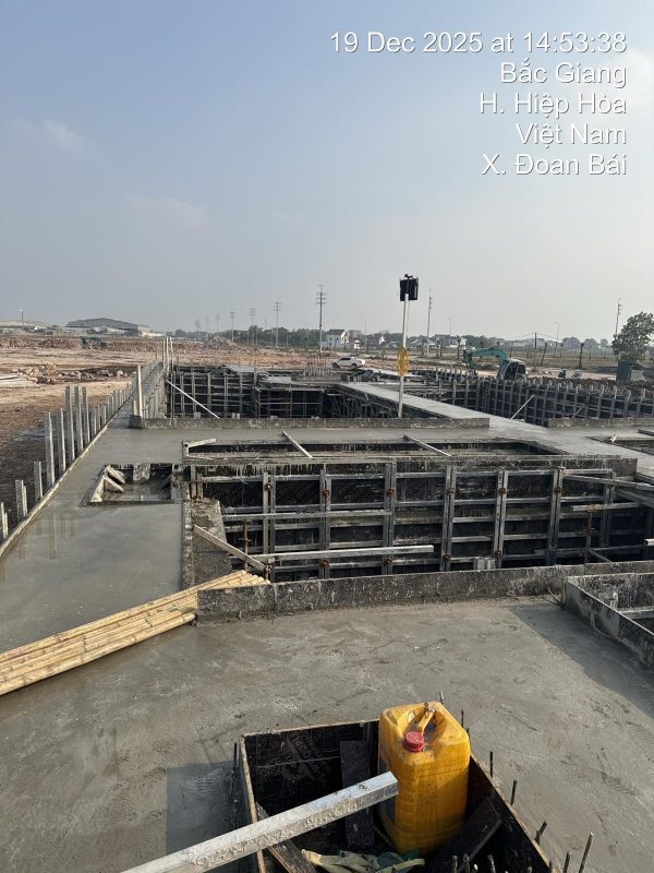 Trạm XLNT tập trung CCN Đoan Bái – Lương Phong 1 đến ngày 19/12/2025 đã hoàn thành Bê Tông tường sàn bể, đang trong quá trình đổ Bê Tông đáy bể gom